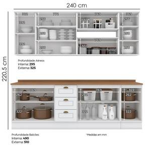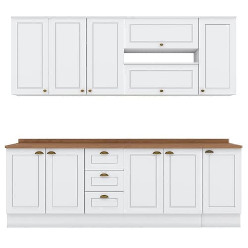 Cozinha modulada no estilo das clássicas cozinhas com conceito americano. Conjunto com 10 peças: 1 balcão de pia 120 cm (com tampo de 120 cm), 1 balcão de 80 cm (com tampo de 80 cm), 1 balcão de 40 cm (com tampo de 40 cm), 1 armário aéreo de 120 cm, 2 armários aéreos basculantes de 80 cm e 1 armário aéreo de 40 cm.