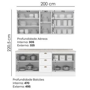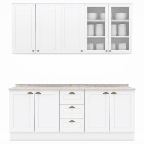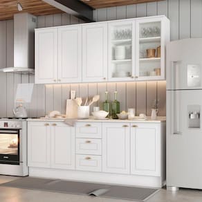 Conceito inspirado nas clássicas cozinhas estilo americano. Um conjunto modular com 6 peças: 1 balcão de pia 120 cm (com tampo de 120 cm), 1 balcão de 80 cm (com tampo de 80 cm), 1 armário aéreo de 120 cm e 1 armário aéreo de 80 cm. Estrutura feita em MDF de 15mm (fundo com 3mm e tampos em MDP de 25mm), com portas equas com dobradiças metálicas de 35 mm e amortecimento, sendo 2 portas com vidro. Conta com 7 prateleiras internas que suportam até 8 kg cada. Acabamento em pintura UV texturizada fosca. Portas e gavetas com usinagem em baixo relevo, e puxadores em metal zamac. Instalação suspensa opcional com ferragens inclusas. Produto entregue em 06 volumes.