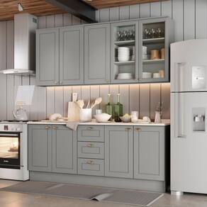 Conceito inspirado nas clássicas cozinhas estilo americano. Um conjunto modular com 6 peças: 1 balcão de pia 120 cm (com tampo de 120 cm), 1 balcão de 80 cm (com tampo de 80 cm), 1 armário aéreo de 120 cm e 1 armário aéreo de 80 cm. Estrutura feita em MDF de 15mm (fundo com 3mm e tampos em MDP de 25mm), com portas equas com dobradiças metálicas de 35 mm e amortecimento, sendo 2 portas com vidro. Conta com 7 prateleiras internas que suportam até 8 kg cada. Acabamento em pintura UV texturizada fosca. Portas e gavetas com usinagem em baixo relevo, e puxadores em metal zamac. Instalação suspensa opcional com ferragens inclusas. Produto entregue em 06 volumes.