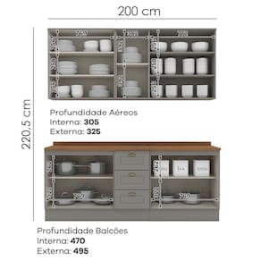 Conceito inspirado nas clássicas cozinhas estilo americano. Conjunto modular com 6 peças: 1 balcão de pia 120 cm (com tampo de 120 cm), 1 balcão de 80 cm (com tampo de 80 cm), 1 armário aéreo de 120 cm e 1 armário aéreo de 80 cm. Estrutura em MDF de 15mm (fundo 3mm, tampos em MDF de 25mm), com portas com dobradiças metálicas de 35 mm com amortecimento e fechamento suave, sendo 2 portas de vidro. Possui 7 prateleiras internas com capacidade para até 8 kg cada. Acabamento em pintura UV texturizada fosca, portas e gavetas com usinagem em baixo relevo, e puxadores em metal zamac. Instalação suspensa opcional com ferragens inclusas. Produto entregue em 06 volumes.