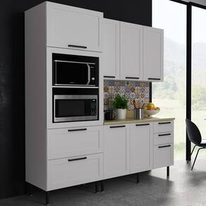 Conjunto de cozinha 04 peças, composto por um armário aéreo, uma torre quente e um balcão para pia com tampo. Balcão, Armário e Torre composto por estrutura 100% MDF 15mm com acabamento em pintura UV (brilho) e Tampo de 30mm com acabamento em pintura BP (semibrilho). Conta com 6 portas equipadas com dobradiças de 35 mm com amortecimento slow motion. Balcão com 3 gavetas com corrediças telescópicas (sendo uma com divisor de talheres), puxadores em alumínio e pés reguláveis em PVC com altura de 17 cm e detalhe cromado. Torre com porta basculante e duplo pistão a gás, 2 gavetas com corrediças telescópicas e 2 nichos abertos ideais para forno e micro-ondas (Medidas dos nichos: A.39cm x L.57,4cm x P.46,5cm / A.35,8cm x L.57,4cm x P.46,5cm). Toda linha contem portas com detalhes em usinagem de baixo relevo no estilo provençal. Excelente para quem busca um móveis funcionais e ótimo desempenho. Este móvel chegará na sua casa separado em 07 volumes.