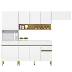 Cozinha Modulada 4 Peças, estilo moderno em módulos que se adaptam ao seu espaço! Produzido em MDP (15mm) com acabamento em pintura UV texturizada. Composta por 09 portas totais (sendo uma delas basculante e superiores com sistema passante), gaveta com corrediças telescópicas, nicho decorativo e nicho para microondas/forno, prateleiras internas, passa fio embutido e puxadores em perfil alumínio (portas inferiores). Os pés reguláveis são em plástico resistente. Este produto será entregue em 06 volumes.