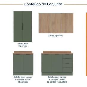 A Cozinha Ipanema é um móvel com design moderno, feito com material de qualidade para garantir alta durabilidade e resistência contra umidade. conferem versatilidade e praticidade no dia a dia, permitindo armazenar diferentes objetos. Uma opção de móvel prático e funcional para quem busca organização e estilo em sua casa. Altura do Conjunto: 135 cm Ambiente Principal: Cozinha codigo_ean: 7909903352465 Cor: Verde Folha/Acácia/Branco Cor do Produto: Verde Folha/Acácia/Branco Informação Complementar: 1x Armário Aéreo 2 Portas 80x135cm Puxador 150mm Ipanema Verde Folha/BrancoLargura: 80 cmAltura: 135 cmPeso: 38,27 kgProfundidade: 36,7 cmNecessita Montagem: Sim1x Armário Aéreo 3 Portas 120cm Puxador 150mm Ipanema Acácia/BrancoLargura: 120 cmAltura: 69,5 cmPeso: 31,44 kgProfundidade: 36,7 cmNecessita Montagem: Sim1x Balcão 2 Portas Com Tampo e Rodapé Ipanema Verde Folha/BrancoLargura: 80 cmAltura: 93 cmPeso: 32,59 kgProfundidade: 52 cmNecessita Montagem: Sim1x Balcão Pia 2 Portas 4 Gavetas com Tampo e Rodapé Ipanema Verde Folha/BrancoLargura: 120 cmAltura: 93 cmPeso: 54,06 kgProfundidade: 52 cmNecessita Montagem: Sim Possui Portas: Sim
