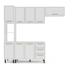 Caracteristicas: 3 Gavetas com corredicas telescopicas, que suportam peso maximo de 3 kg 2 Nihcos de 37x37cm suportam peso maximo de 10 kg 8 Portas bater com dobradicas metalicas e basculante com pistao a gas 2 Prateleiras que suportam peso maximo de 5 kg Acabamento em pintura UV Semi-Fosco Base balcao com 3 gavetas e armario aereo de 120cm suporta peso maximo 10kg Estrutura em MDF/MDP Itens Inclusos Kit Ferragens e Manual de Montagem Pes regulaveis Puxadores de aluminio Prateleiras do paneleiro suportam peso maximo de 10kg