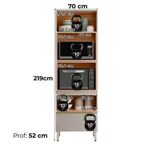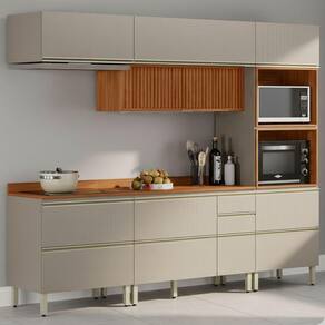 A Cozinha Modulada DP2706 foi projetada para quem busca eficiência, design moderno e funcionalidade na cozinha. O conjunto é composto por 5 peças, produzidas 100% em MDF (20/15 mm) com acabamento em pintura UV. Possui portas com dobradiças metálicas de 35 mm (sendo 6 basculantes com pistão a gás e 1 delas contém detalhes em ripado baixo relevo), gavetas laterais (uma com divisor de talheres) e gavetão inferior, todas equipadas com corrediças telescópicas. Conta ainda com pés com regulagem de altura, puxadores em alumínio, nicho decorativo funcional, tampo em MDF 20mm e espaços ideais para micro-ondas e forno (de até A.45,4cm x L.64cm x P.51,5cm). NÃO ACOMPANHA COOKTOP/ NÃO ACOMPANHA RECORTE NO TAMPO PARA ENCAIXE. Este produto será entregue em 08 volumes.
