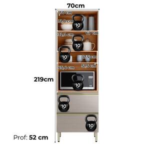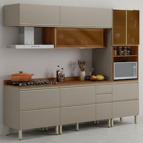 A Cozinha Modulada DP2705 foi projetada para quem busca eficiência, design moderno e funcionalidade na cozinha. O conjunto é composto por 5 peças, produzidas 100% em MDF (20/15 mm) com acabamento em pintura UV. Possui portas com dobradiças metálicas de 35 mm (sendo 6 basculantes com pistão a gás e 1 delas contém vidro Reflecta 3mm), gavetas laterais (uma com divisor de talheres) e gavetão inferior, todas equipadas com corrediças telescópicas. Conta ainda com pés com regulagem de altura, puxadores em alumínio, nicho decorativo funcional, tampo em MDF 20mm e espaço para micro-ondas ou forno (até A.45,4 cm x L.67 cm x P.51,5 cm). NÃO ACOMPANHA COOKTOP/ NÃO ACOMPANHA RECORTE NO TAMPO PARA ENCAIXE. Este produto será entregue em 09 volumes.
