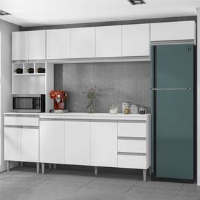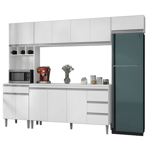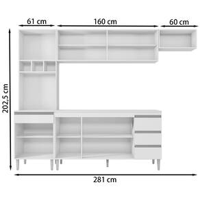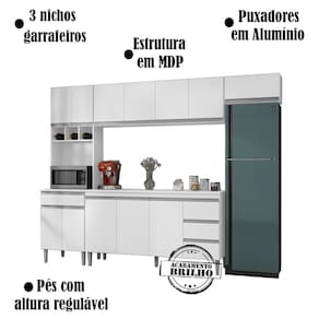 Cozinha Modulada 5 Peças 281 cm Andreia, ideal para quem busca modernidade e sofisticação ao ambiente. Estrutura em MDP de 12 e 15 mm, acabamento com pintura UV. Composto por 12 portas articuladas com dobradiças metálicas, sendo uma basculante com pistão a gás, espaço para microondas ou demais aparelhos de utilidade doméstica, 3 nichos garrafeiros, 4 gavetas com corrediças metálicas com deslize suave, balcão com espaço opcional de 155 cm para colocação de pia (pia não inclusa), possui tampo resistente, prateleiras internas para organizar seus utensílios, puxadores em alumínio, e acompanham pés em PVC com regulagem. Você pode adquirir outras peças dessa composição que são vendidas separadamente no nosso site. Produzido com controle de qualidade e com excelente acabamento. Estes móveis chegarão na sua casa separados em 5 volumes.
