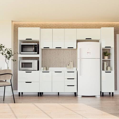Caracteristicas: 4 Gavetas com corredicas telescopicas 4 Nichos sendo dois para forno e micro-ondas 10 Portas e tres sendo basculantes com pistao a gas Acabamento FF em Pintura UV Base do balcao 10kg distribuidos Dobradicas de metal Estrutura em MDP 15mm Gavetas com capacidade ate 3kg Pes com regulagem Puxadores cava Prateleiras com capacidade de 5 a 10kg Tampo suporta 15kg