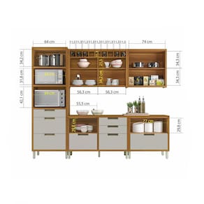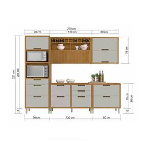 Diferenciais únicos: Modernas portas com abertura basculante e pistão a gás. Modernos puxadores embutidos em alumínio, beleza, qualidade e durabilidade. Gavetas com corrediça telescópica abertura integral e organizador de talheres. Ergonômicos gavetões com laterais e traseiros altos para armazenagem com segurança de utensílios e mantimentos. Paneleiro com dois nichos, micro-ondas e forno elétrico, sendo o nicho de forno elétrico com duto de liberação de calor. Pratica gaveta porta temperos e gaveta com organizador de talheres.