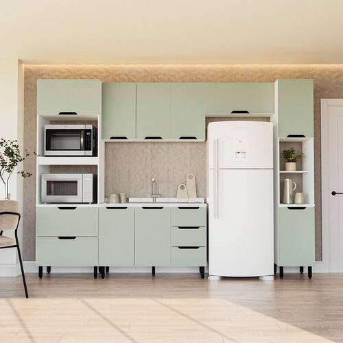 Caracteristicas: 4 Gavetas com corredicas telescopicas 4 Nichos sendo dois para forno e micro-ondas 10 Portas e tres sendo basculantes com pistao a gas Acabamento FF em Pintura UV Base do balcao 10kg distribuidos Dobradicas de metal Estrutura em MDP 15mm Gavetas com capacidade ate 3kg Pes com regulagem Puxadores cava Prateleiras com capacidade de 5 a 10kg
