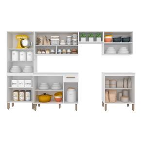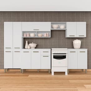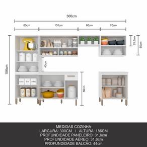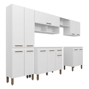 Detalhes Técnicos -MDP -Pintura em FF (Finish Foil) -Tonalidade: Branco -13 Pés em Polietileno -12 Portas com Dobradiças Metálicas -13 Puxadores em Polietileno -7 Prateleiras -3 Nichos -1 Gaveta com Corrediça Metálica -Prateleiras e Gaveta suportam até 5kg -Balcão acompanha o tampo