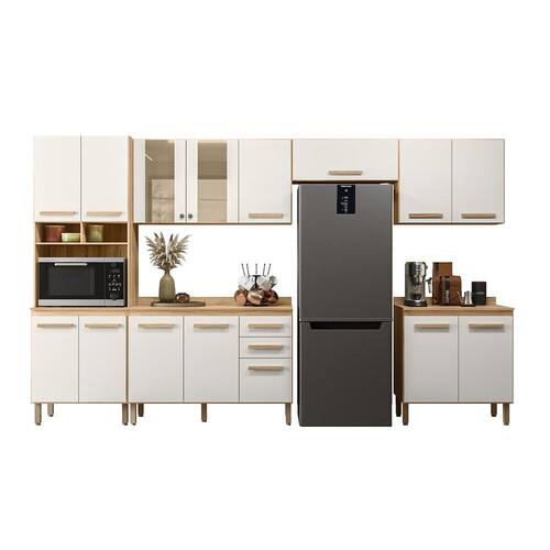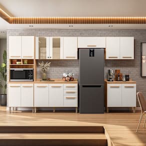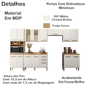 A Cozinha Modulada 17008 tem o acabamento refinado e visual sofisticado. Estrutura em MDP, com caixa de 12 mm e frente em 15 mm, e excelente acabamento em Fosco/Brilho. Composto por 15 portas, sendo 02 portas de vidros, com dobradiças metálicas e pistão a gás. Conta também com prateleiras internas e 02 gavetas com corrediças metálicas, puxadores em MDF. Paneleiro com nicho e espaço para micro-ondas. Balcão 1,20 com tampo. Acompanha pés de 15,5 cm com regulagem de 1,5 cm de altura. Estes móveis chegarão em sua casa separados em 06 volumes.