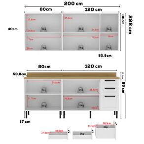 Cozinha modular completa com 06 peças, sua casa merece o melhor do estilo provençal! Cozinha incluso dois armários aéreos (120cm e 80cm), dois balcões (120cm para pia e 80cm) e tampo 120 cm. Estrutura completa 100% em MDF 15mm com acabamento em pintura UV brilho (tampo 30mm, acabamento em pintura BP semibrilho), além de conter portas com detalhes em usinagem de baixo relevo, no estilo provençal. Conta com 9 portas equipadas com dobradiças de 35 mm com amortecimento slow motion. Balcão de 120cm com 3 gavetas com corrediças telescópicas (sendo uma com divisor de talheres), puxadores em alumínio e pés reguláveis em PVC com altura de 17 cm e detalhe cromado. Este móvel chegará na sua casa separado em 09 volumes.