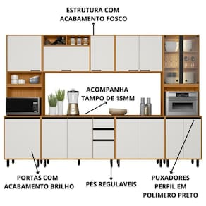 Transforme seu ambiente com a Cozinha Modulada 6 Peças sendo Balcão com Tampo, conta com excelente qualidade e acabamento de alto padrão, possui estrutura em MDP 15mm e tampo de 15mm de espessura, com pintura UV. Composta por 15 portas com dobradiças reforçadas de 26mm, sendo 1 das portas basculante equipada com pistão a gás, e 2 delas com vidro transparente 4mm, conta também com 2 gavetas com corrediças telescópicas que possibilita a abertura total. O Paneleiro possui compartimento exclusivo para micro-ondas (A.50cm x L.57cm x P.50cm), proporcionando praticidade e aproveitamento de espaço além do nicho decorativo (A.19cm x L.57cm x P.29cm). O Balcão permite acomodar uma pia de até 120 cm x 50 cm e para usar o balcão para pia a fixação dos afastadores é de montagem obrigatória. O Paneleiro 4 portas vem com iluminação em LED como um diferencial, oferecendo um toque de sofisticação e iluminação especial ao ambiente e também um compartimento exclusivo para micro-ondas (A.52cm x L.57cm x P.50cm). O acabamento acetinado nas portas proporciona um toque de sofisticação, puxadores em polímero preto, prateleiras internas com amplo espaço para armazenamento, pés reguláveis de 17 cm em PVC. Este conjunto é ideal para quem busca aliar estética e praticidade, transformando a cozinha em um espaço agradável e eficiente. Este móvel chegará em sua casa separado em 7 volumes.