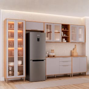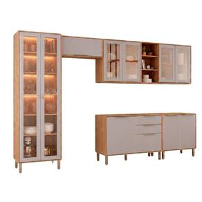 Cozinha Modulada 6 Peças Brilhante com 1 Cristaleira 2 Balcões 3 Armários Aéreo Cinamomo/Platina - Bege