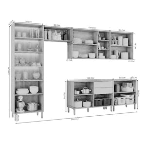Medida de cada item (A x L x P): Cristaleira: 224 x 70 x 47; Balcão: 84 x 120 x 47; Balcão: 84 x 80 x 47; Aéreo: 78 x 120 x 32; Aéreo: 34 x 80 x 32; Aéreo: 78 x 80 x 32