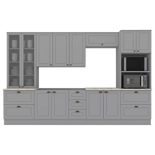 Cozinha modulada no estilo das clássicas cozinhas com conceito americano. Conjunto com 7 peças: 1 balcão de pia 120 cm (sem tampo), 1 balcão de 80 cm (com tampo, com recorte para cooktop 4 bocas e pré-marcação para 5 bocas), 1 armário aéreo de 120 cm, 1 armário aéreo basculante de 80 cm, 1 cristaleira 72 cm e 1 torre quente 72 cm (espaços para eletros: 1 A: 42,4 x L: 68,4 x P: 48 cm | 2 A: 38,6 x L: 68,4 x P: 53,3 cm). Estrutura em MDF de 15mm (fundo com 3mm, tampos em MDP de 25mm), portas com dobradiças metálicas 35 mm com amortecimento, sendo 2 portas de vidro. São 9 prateleiras com capacidade de até 8 kg cada. Acabamento em pintura UV texturizada (fosco), portas e gavetas com usinagem em baixo relevo e puxadores em metal zamac. Opção de instalação suspensa, sem pés (ferragens inclusas). Produto entregue em 11 volumes.