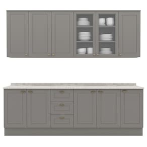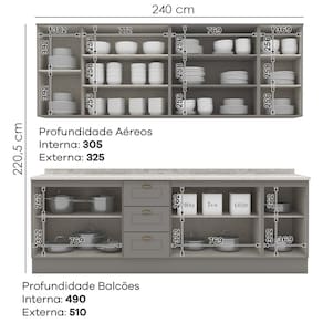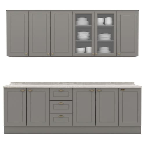 Cozinha modulado no estilo das clássicas cozinhas com conceito americano. Um conjunto modular de cozinha sendo 9 peças: 1 balcão de pia 120 cm (com tampo), 1 balcão de 80 cm (com tampo), 1 balcão de 40 cm (com tampo) 1 armário aéreo de 120 cm, 1 armário aéreo de 80 cm e 1 armário aéreo de 40 cm. Todo o conjunto com estrutura feita 100% MDF de 15mm (fundo com 3mm, tampos em MDF de 25mm), portas com dobradiças metálicas 35 mm com amortecimento sendo 2 portas de vidro, total de 10 prateleiras suportando até 8 kg cada. Acabamento em pintura UV texturizada (fosco), portas e gavetas com detalhes de usinagem em baixo relevo, além do destaque em seus puxadores em metal zamac. Opção de instalação sem pés, suspenso (ferragens para fixação na parede inclusas). Este móvel chegará na sua casa separado em 9 volumes.