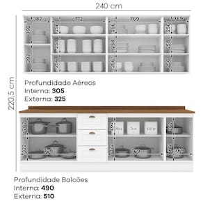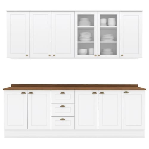 Cozinha modulada no estilo das clássicas cozinhas com conceito americano. Um conjunto modular com 9 peças: 1 balcão de pia 120 cm (com tampo), 1 balcão de 80 cm (com tampo), 1 balcão de 40 cm (com tampo), 1 armário aéreo de 120 cm, 1 armário aéreo de 80 cm e 1 armário aéreo de 40 cm. Estrutura feita em MDF de 15mm (fundo com 3mm, tampos em MDF de 25mm), portas com dobradiças metálicas 35 mm com amortecimento sendo 2 portas de vidro. Possui 10 prateleiras com capacidade para até 8 kg cada, acabamento em pintura UV texturizada (fosco), portas e gavetas com usinagem em baixo relevo e puxadores em metal zamac. Opção de instalação suspensa, sem pés (ferragens inclusas). Produto enviado em 9 volumes.