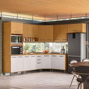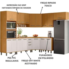 Cozinha Modulada Canto 9 Peças sendo Balcão de Pia com Tampo, conta com excelente qualidade e acabamento de alto padrão, possui estrutura em MDP de 15mm e tampo de 25mm de espessura, acabamento acetinado fosco e ripado nas portas sendo impressão no MDP imitando ripado de madeira . Composta por 17 portas com dobradiças metálicas, 2 portas basculantes com pistão a gás, 2 gavetas com corrediças telescópicas com fechamento leve e suave, nichos para condimentos ou objetos decorativos, prateleiras internas com amplo espaço para armazenamento, equipada com puxadores de polímero, acompanha pés em PVC com regulagem de altura. Este móvel chegará em sua casa separado em 14 volumes.
