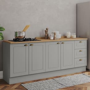 A Cozinha Modulada Americana 2 Peças da Móveis Henn une funcionalidade e elegância em um conjunto compacto e prático! Com estrutura em MDF e pintura UV, conta com frentes usinadas em baixo relevo e puxadores concha em zamac ouro velho, que dão um toque clássico ao ambiente. Os balcões de 120cm e 80cm oferecem amplo espaço interno, portas com dobradiças metálicas com amortecimento e gavetas com corrediças telescópicas. O balcão 120cm pode ter as gavetas montadas em ambos os lados e já acompanha tampo em MDP, assim como o balcão 80cm, ideal para instalação de cooktop. Pés em ABS com regulagem garantem estabilidade e praticidade.
