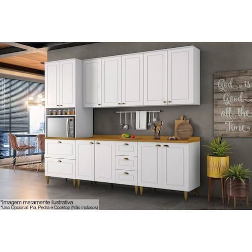 Cozinha Completa Americana c/ Pés 7 Peças (2Aéreos+2Balcões+1Paneleiro+2Complementos) C5P60 Branco - Henn Abaixo segue os produtos que compoem o KIT: - Tampo p/ Balcão Cozinha 80x53cm Nature - Henn - 1 unidades Dimensões: Alt: 3cm x Larg80cm x Comp/Profund:80cm