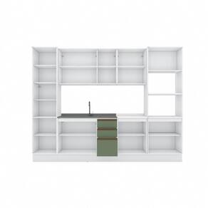 Acabamento: Pintura Brilho / Pintura Fosco | Cor: Branco/Verde Oliva | Corrediças: Telescópicas | Dobradiça: Com Amortecimento | Garantia: 3 meses para defeito de fabricação | Matéria-prima: MDF / MDP | Peso suportado por cada gaveta: 6 Kg | Peso suportado por cada prateleira: 7 kg | Puxadores: Alumínio / Metálicos / Puxadores de Metal e de Alumínio | Quantidade de gavetas: 3 | Quantidade de portas: 1 / 3 | Quantidade de prateleiras: 1 / 2 / 4 / 5 | Sistema de montagem: Parafuso Philips | Tipo de porta: Bater