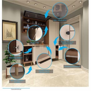 Informações Complementares Possui porta condimentos que deslizam por corrediças telescópicas, com 2 suportes internos. Porta Basculante com abertura auxiliada por Pistão a Gás 80N, moldura em Alumínio Preto e Vidro Reflecta 3 Nichos decorativos Pés com regulagem de altura Suporta até: 1kg no porta condimentos, 9kg nas prateleiras e 15kg na base. Distribua uniformemente os objetos