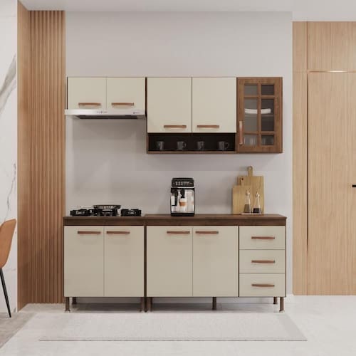 QUANTIDADE DE GAVETAS: 3 | LARGURA (CM): 190 | QUANTIDADE DE PORTAS: 9 | MATERIAL: MDP | ALTURA (CM): 204,5 | PROFUNDIDADE (CM): 53 | TAMPO DO BALCÃO INCLUSO: Sim | QUANTIDADE DE PEÇAS: 4 | Tipo de móveis de cozinha: Completa | Requer Montagem: Sim | Materiais do Corpo: MDP | Inclui manual de montagem: Sim | Cor: Noce/Off-White