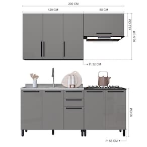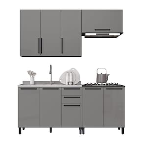 Fabricada em MDP de alta qualidade, possui pintura UV perolizada na sofisticada cor Titânio, dobradiças com slow motion, corrediças telescópicas, puxadores metálicos e pés com regulagem que permitem ajuste de altura em até 3cm. O diferencial desta versão está na possibilidade de personalização: o balcão de 120cm não acompanha tampo, ideal para instalação de pia, enquanto o balcão de 80cm já acompanha tampo fechado, pronto para uso.