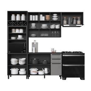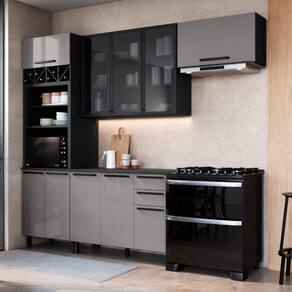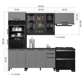 Fabricada em MDP de alta qualidade, a cozinha possui pintura UV perolizada na elegante cor Titânio, prateleiras removíveis e tampo maciço de 22mm. Os detalhes como vidro fumê, puxadores metálicos, dobradiças com slow motion e corrediças telescópicas garantem praticidade, resistência e acabamento de alto padrão. Os pés com regulagem adicionam até 3cm de altura, oferecendo ainda mais flexibilidade na instalação.