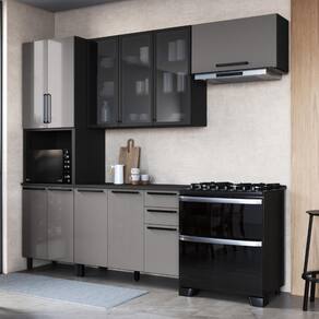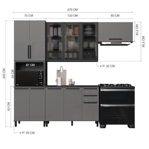 Materiais do corpo: MDP | Altura (cm): 240 | Largura (cm): 270 | Quantidade de portas: 11 | Conteúdo da embalagem: Torre quente, Aéreo 120cm, Aéreo 80cm, Balcão 120cm e Manual de Montagem. | Profundidade (cm): 53 | Tipo de móveis de cozinha: Cozinha Compacta | Inclui manual de montagem: Sim | Requer montagem: Sim | Marca: Fidelitá Móveis | Estilo: Moderno | Condição do item: Novo | Modelo: Mônaco | Cor: Chumbo/Titânio
