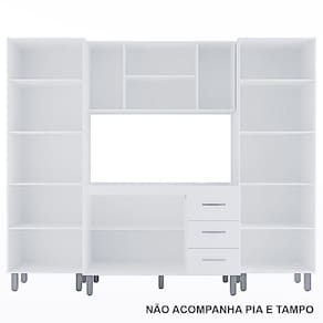 Características: Estrutura em MDP Acabamento em pintura UV 14 Portas com Dobradiças Metálicas 03 Gavetas com Corrediças Metálicas Puxadores em Plástico Cromados Altura dos Pés 16 cm Pés com Regulagem Prateleiras e Amplo Espaço Interno Espaço para Forno e Microondas NÃO ACOMPANHA PIA E TAMPO
