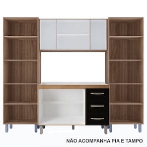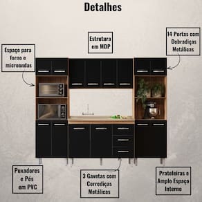 Características: Estrutura em MDP Acabamento em pintura UV 14 Portas com Dobradiças Metálicas 03 Gavetas com Corrediças Metálicas Puxadores em Plástico Cromados Altura dos Pés 16 cm Pés com Regulagem Prateleiras e Amplo Espaço Interno Espaço para Forno e Microondas NÃO ACOMPANHA PIA E TAMPO