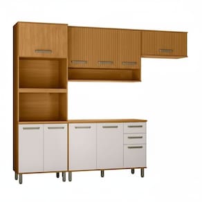 Informações Complementares: Portas com acabamento ripado gráfico, nicho para forno e micro-ondas, porta basculante com pistão a gás, balcão com tampo 27mm, dobradiças de 35mm, prateleiras, corrediças telescópicas, puxadores em polímero, pés PVC reguláveis.