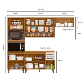 Medida de cada item (A x L x P): Paneleiro torre quente: A.228cm x L.70cm x P.50cm | Aéreo 3 portas: A.79cm x L.120cm x P.32cm | Aéreo geladeira: A.40cm x L.80cm x P.32cm | Balcão 120cm: A.89cm x L.120cm x P.50cm.