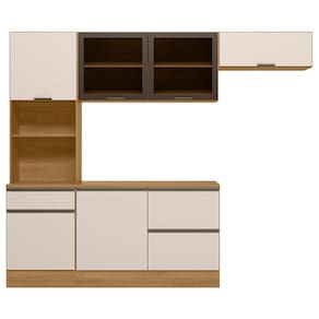 Medida de cada item (A x L x P): Paneleiro Duplo: A.215cm x L.58cm x P.SUP.37cm / P.INF.50cm | Aéreo 2 portas vidro: A.59cm x L.120cm x P.37cm| Aéreo Geladeira: A.30cm x L.80cm x P.37cm | Balcão 120cm com tampo: A.86cm x L.120cm x P.50cm.
