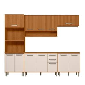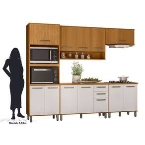 Informações Complementares: Portas com acabamento ripado gráfico, nicho para forno e micro-ondas, porta basculante com pistão a gás, balcões com tampo de 27mm, dobradiças de 35mm, prateleiras, balcão duplo com prateleira removível, corrediças telescópicas, puxadores em polímero, pés