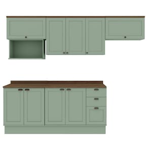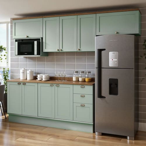 Nicho para micro-ondas Acabamento da Prateleira: Pintura Escala de Brilho da Prateleira: Fosco Acabamento da Gaveta: BP Melamínico Escala de Brilho da Gaveta: Fosco Material do Puxador da Gaveta: ABS Acabamento da Porta: BP Melamínico Escala de Brilho da Porta: Fosco Material do Puxador da Porta: ABS Acabamento dos Pés: Pintura Acompanha Rodapé Decorativo: Sim Acompanha Tampo: Sim Altura dos Pés: 17 cm Altura Máxima dos Pés: 17.0000 Ambiente Principal: Cozinha Balcão Suporta Pia: Sim codigo_ean: 7900288288707 Complexidade da Montagem: Alta: deve ser montado por um montador especializado Cor: Verde Mint/Ébano Fosco Cor do Produto: Verde Mint/Ébano Fosco Cor Flex: Não Cor Interna: Verde Mint Escala de Brilho: Fosco Espessura do Material da Estrutura: 15 mm Espessura do Tampo: 2,5 mm Gaveta com Chave: Não Informações Complementares: Cozinha Modulada Completa 6 Peças 100% MDF Internacional Provençal com Tampo e Rodapé Itens Inclusos: 1 Cozinha Completa, Kit Ferragens e Manual de Montagem Linha ou Coleção: Iluminata Manual de Montagem e Instalação: https://product-hub-prd.madeiramadeira.com.br/152026449/documents/343a5ef4-c93d-4a5a-8c48-16b0966ee8e9333146473417640968201041.pdf Marca: Genialflex Material da Corrediça: Metálica Material da Dobradiça/Corrediça da Porta: Metálica Material da Gaveta: MDF Material da Porta: MDF Material da Prateleira: MDF Material do Fundo: MDF Material do Tampo: MDF Material dos Pés: ABS Medida de cada item (A x L x P): Aéreo basculante de 80cm(46,5x80x31,5) Aéreo basculante de 80cm(46,5x80x31,5) Aéreo de 120cm(78x120x31,5) Balcão de 80cm (93,5x80x52) Balcão de 120cm(93,5x120x52) modular: Sim Montagem Flex: Sim, os módulos podem ser posicionados em lugares diferentes. Necessita Montagem: Sim O Balcão Acompanha Pia: Não Origem do Produto: Nacional Pés Reguláveis: Sim Peso: 173 kg Peso Máximo por Gaveta: 5 kg Peso Máximo por Prateleira: 5 kg Possui Pés: 09 Possui Portas: Sim Possui Prateleiras: Sim Possui recorte para Cooktop: Não Possui Rodízio: Não Possui Vidro: Não Produto Montado: Sim Recomendações de Uso, Manutenção e Limpeza: LIMPAR COM PANO UMEDECIDO E NUMERO DAS PEÇAS RETIRAR COM ALCOOL Sapatas Niveladoras: Sim Sistema de Montagem: Parafusos e Cavilhas Suporta Até (kg): 65 kg Tamanho Indicado da Pia: 120 Tipo de Corrediça da Gaveta: Metálica Telescópica Tipo de Dobradiça da Porta: Soft close Tipo de Puxador da Gaveta: Externo Tipo de Puxador da Porta: Externo