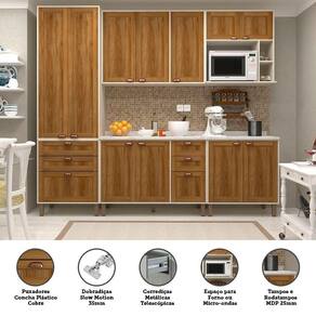 Desenvolvida com materiais de altissima qualidade, a Cozinha Sofia oferece excelente distribuicao de espaco interno, dobradicas Slowmotion com amortecedor incorporado para fechamento suave das portas. Puxadores plasticos na cor Bronze e pes em Ps (poliestireno) na cor champagne com regulagem de altura.