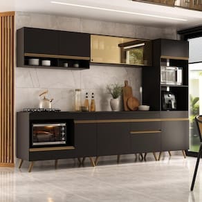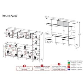Dimensões do produto montado (L x A x P): 287 x 203 x 53 cm (balcões), 32 cm (aéreos)