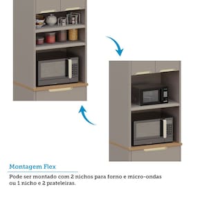 Une praticidade, segurança e um design moderno! Feito 100 em MDF de alta qualidade, ele possui cantos arredondados que oferecem um visual suave e elegante, além de garantir maior segurança ao evitar arestas cortantes. Possui amplo espaço interno, podendo escolher na hora da montagem a configuração que melhor se adapta ao seu espaço, com dois nichos para forno e micro-ondas ou um nicho e duas prateleiras para organizar seus utensílios e mantimentos de forma eficiente. As dobradiças Slow Motion com amortecimento garantem um fechamento suave e silencioso das portas, acrescentando conforto e durabilidade ao móvel enquanto os puxadores embutidos mantêm o visual minimalista e elegante.