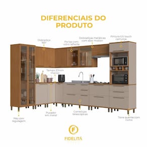 Composição moderna, acabamentos refinados e soluções funcionais fazem desta cozinha modulada uma escolha ideal para quem busca sofisticação e praticidade. A versão com 10 peças da linha Barcelona integra torre quente, cristaleira com LED, módulos de canto e espaço para cooktop, oferecendo tudo o que você precisa em um só ambiente.