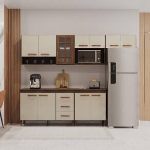 QUANTIDADE DE GAVETAS: 3 | LARGURA (CM): 260 | QUANTIDADE DE PORTAS: 11 | MATERIAL: MDP | ALTURA (CM): 204,5 | PROFUNDIDADE (CM): 53 | TAMPO DO BALCÃO INCLUSO: Sim | QUANTIDADE DE PEÇAS: 5 | Tipo de móveis de cozinha: Completa | Requer Montagem: Sim | Materiais do Corpo: MDP | Inclui manual de montagem: Sim | Cor: Noce/Off-White