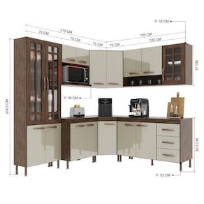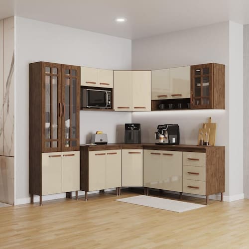 Com módulos avulsos, cada peça é independente, permitindo diferentes composições para melhor aproveitamento do espaço. Seu interior é bem distribuído, com prateleiras e divisórias que auxiliam na organização de utensílios e mantimentos.