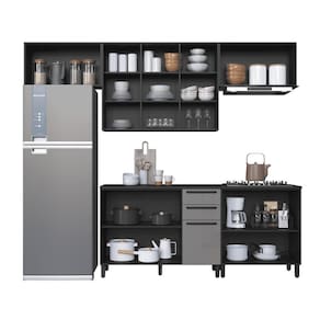 A Cozinha Modulada Mônaco da Fidelitá oferece o equilíbrio perfeito entre elegância e funcionalidade. Com 5 módulos e 280cm de largura, ela possui excelente capacidade de armazenamento, design moderno com portas em vidro fumê e tampo maciço de 22mm incluso.