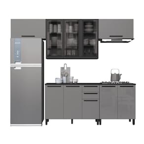 Produzida em MDP de alta qualidade com pintura UV perolizada na cor titânio, essa cozinha é equipada com dobradiças metálicas com slow motion, puxadores em metal, corrediças telescópicas e pés com regulagem de altura (+3cm).