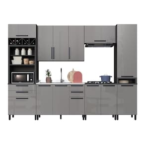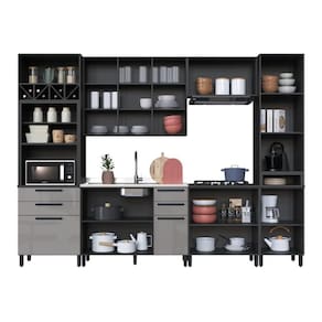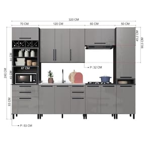 MATERIAL: MDP | Tipo de móveis de cozinha: Cozinha Completa | TAMPO DO BALCÃO INCLUSO: NÃO | QUANTIDADE DE GAVETAS: 4 | QUANTIDADE DE PORTAS: 13 | PROFUNDIDADE (CM): 53 | ALTURA (CM): 240 | QUANTIDADE DE PEÇAS: 6 | LARGURA: 320 | Materiais do corpo: MDP | Inclui manual de montagem: Sim | Cor: Chumbo/Titânio