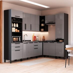 Fabricada em MDP de alta qualidade, essa versão conta com acabamento UV perolizado na cor Titânio, dobradiças metálicas slow motion, corrediças telescópicas, puxadores em metal, prateleiras removíveis, tampo maciço de 22mm (em módulos específicos) e pés com regulagem de altura (+3cm).