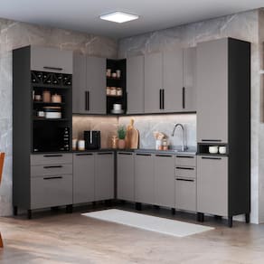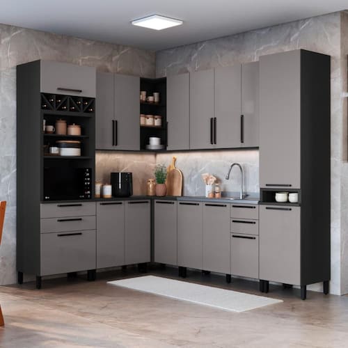 A Cozinha Mônaco da Fidelitá combina funcionalidade, design moderno e acabamento de alto padrão. Composta por 8 módulos, esta versão oferece amplo espaço interno, excelente distribuição e detalhes sofisticados como puxadores em metal e pintura perolizada na elegante cor titânio.